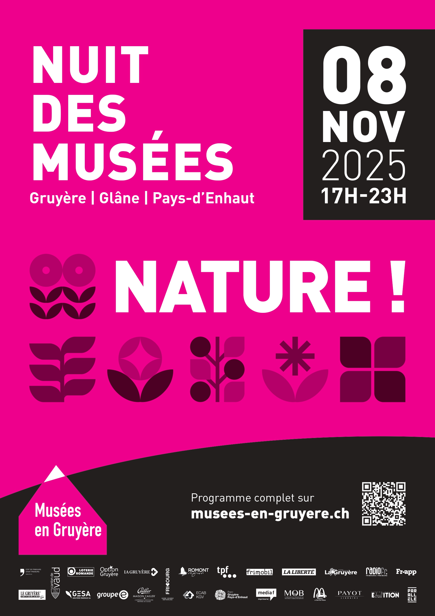 Retrouvez la célèbre Nuits des Musées du Sud fribourgeois le samedi 8 novembre 2025. Placée sous la thématique commune « NATURE ! », cette soirée féérique enchantera petits et grands grâce à de nombreuses animations, découvertes inattendues et dégustations d’ici et d’ailleurs. Un programme concocté par un étonnant réseau de musées qui vous fera passer une soirée inoubliable, que ce soit en Gruyère, en Glâne et au Pays-d’Enhaut. 💗🌙